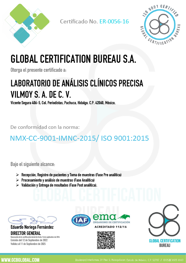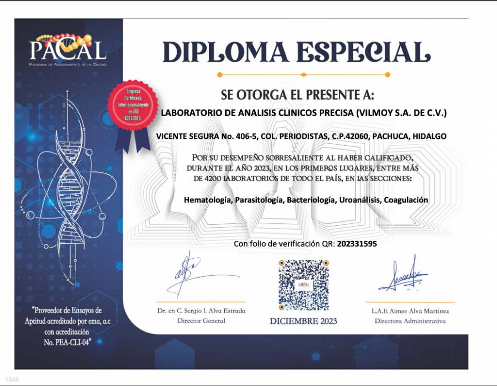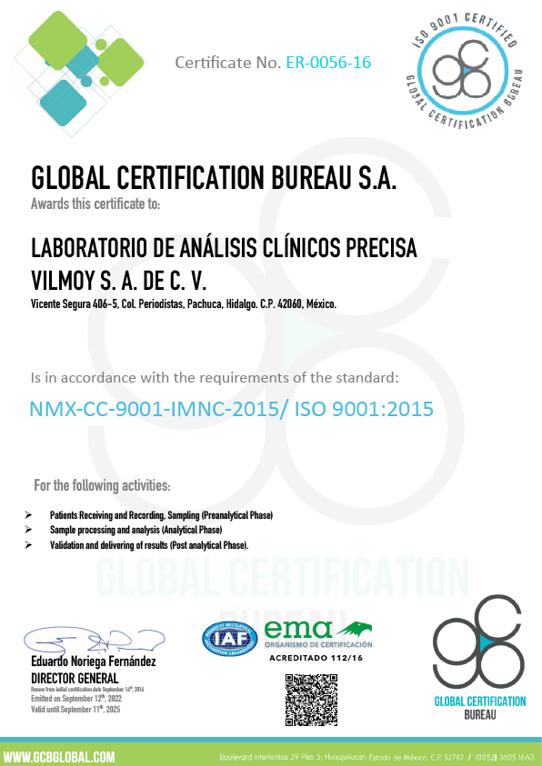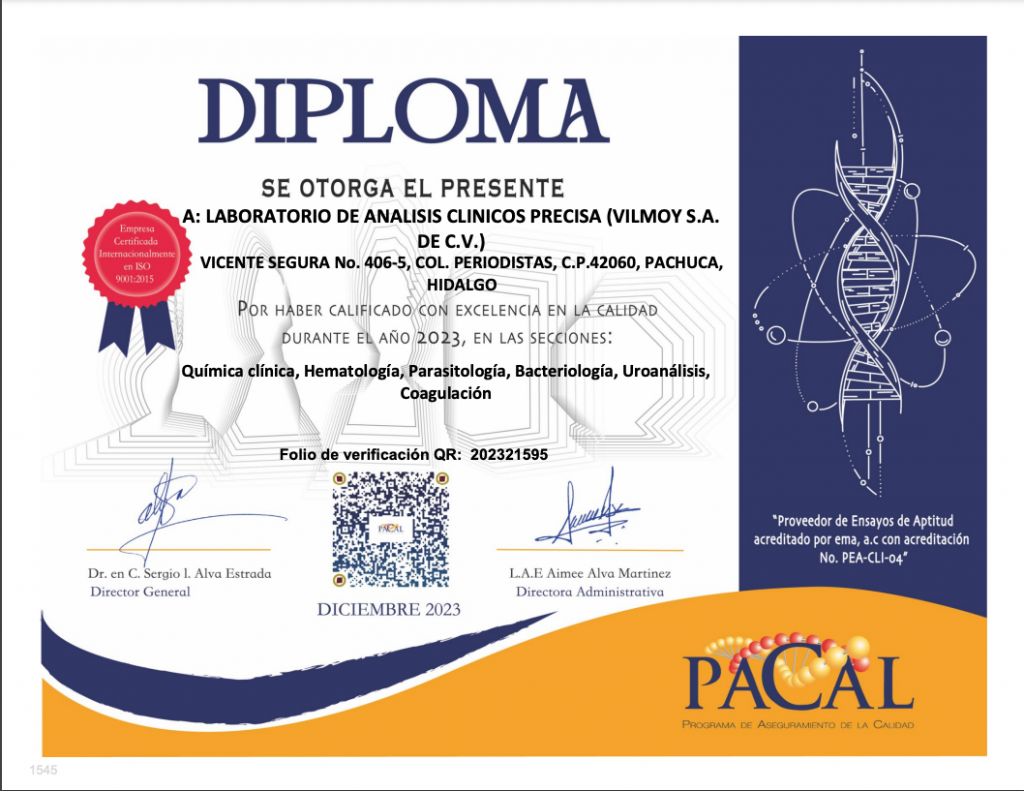 SOMOS UN LABORATORIO CERTIFICADO BAJO LA NORMA ISO 9001-2015 Y CALIFICADO ENTRE LOS PRIMEROS LABORATORIOS EVALUADOS POR EL PACAL (PROGRAMA DE ASEGURAMIENTO DE LA CALIDAD) ENTRE MAS DE 3500 LABORATORIOS EN TODO EL PAIS.